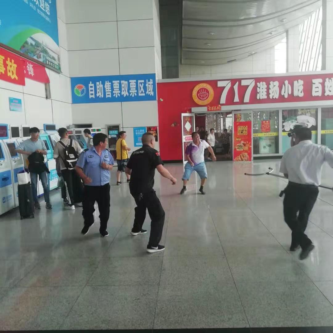 演練過程中,售票廳一名“恐怖分子”突然拿出一把堅(jiān)刀,揮刀砍向進(jìn)站的旅客及周邊群眾,車站工作人員發(fā)現(xiàn)后,立即將情況上報(bào)反恐防暴應(yīng)急領(lǐng)導(dǎo)小組、拉響站內(nèi)報(bào)警鈴、疏導(dǎo)旅客撤離至安全區(qū)域、關(guān)閉大門,并撥打“110”電話報(bào)警,同時(shí)反恐救援組人員使用手持盾牌、防暴鋼叉與歹徒周旋,進(jìn)行前期防控,牽制“恐怖分子”至公安趕赴現(xiàn)場(chǎng),最終成功制服“歹徒”,“事件”得到了及時(shí)有效的處置。