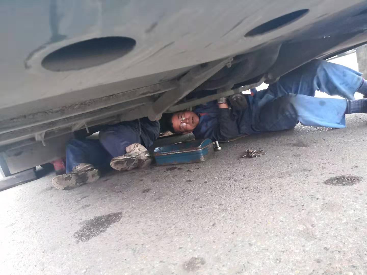 11月21日上午客服總調(diào)親自帶隊(duì),修理廠派出維修精英4人,于11:30抵達(dá)。此時(shí)天空不作美,寒風(fēng)刺骨摻和冰冷雨水,搶修環(huán)境更為惡劣,為盡快恢復(fù)班次,師傅們顧不上吃飯,便開始搶修工作,從變速箱附件拆卸、安裝,變速箱落地、吊裝,分離軸承更換、潤(rùn)滑,每個(gè)步驟環(huán)節(jié)都井然有序,連續(xù)作業(yè)3小時(shí)后,于下午14:30搶修成功。此時(shí),師傅們才放心的吃了飯,穿著濕透的工作服返回?fù)P州。他們?cè)谄椒驳墓ぷ鲘徫簧希眯燎诘暮顾宫F(xiàn)了揚(yáng)汽人默默奉獻(xiàn)的精神。