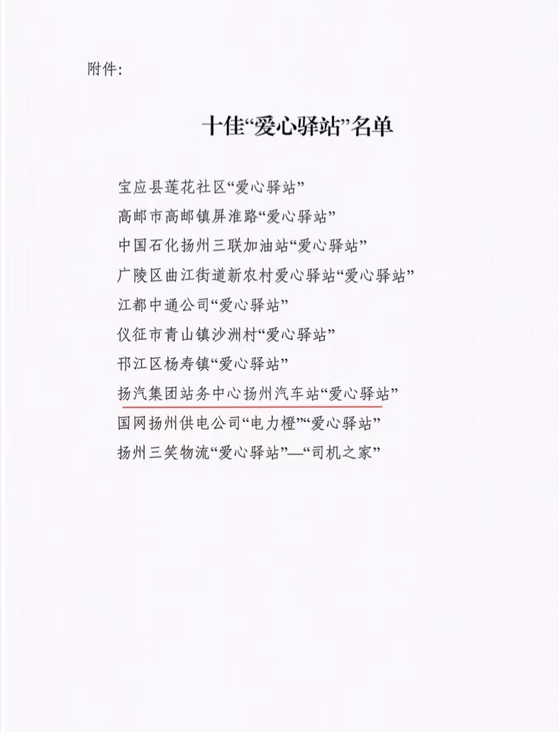 近日,揚州市總工會印發(fā)《關(guān)于命名2022年度十佳“愛心驛站”的通報》,揚汽集團站務中心揚州汽車站榮獲十佳“愛心驛站”榮譽稱號。